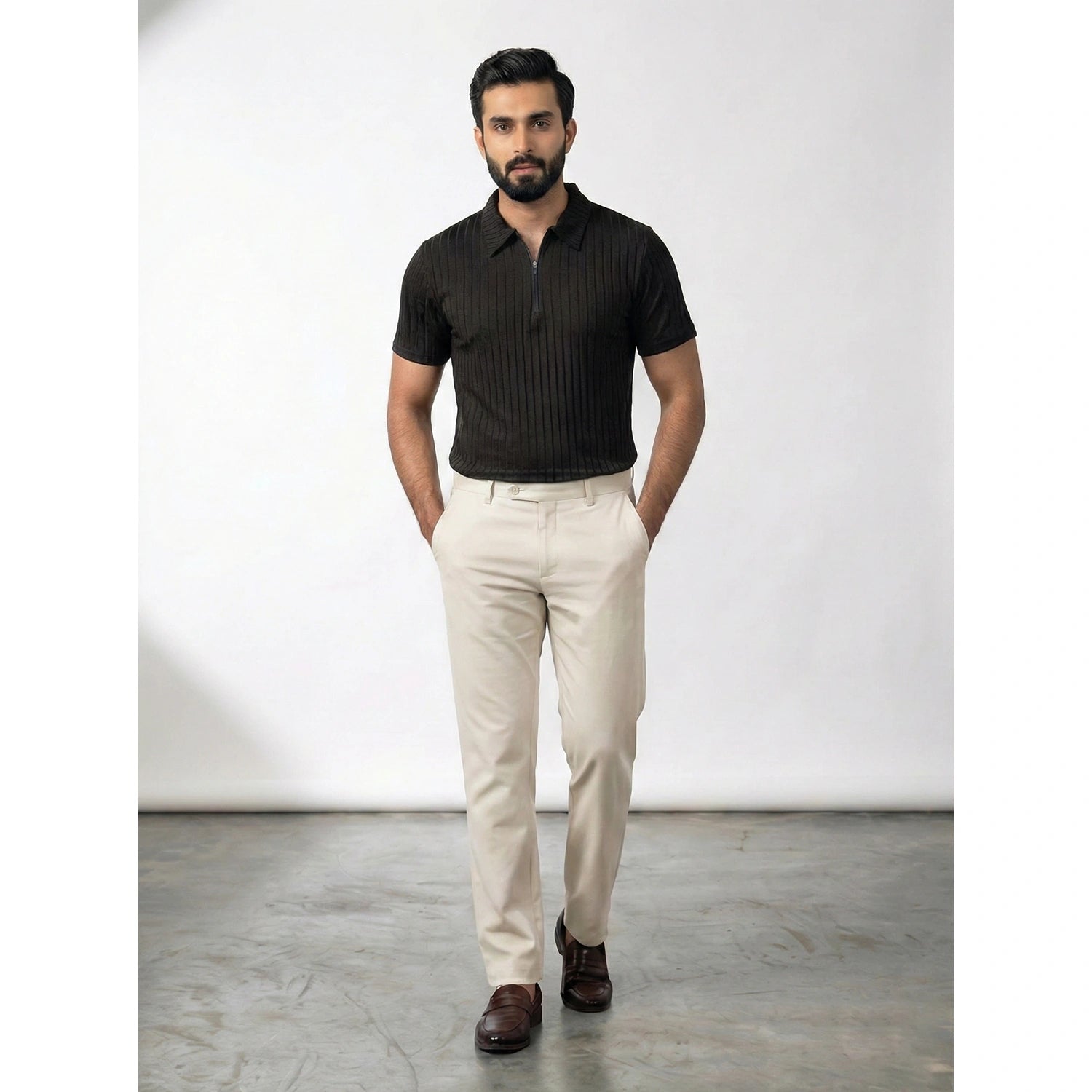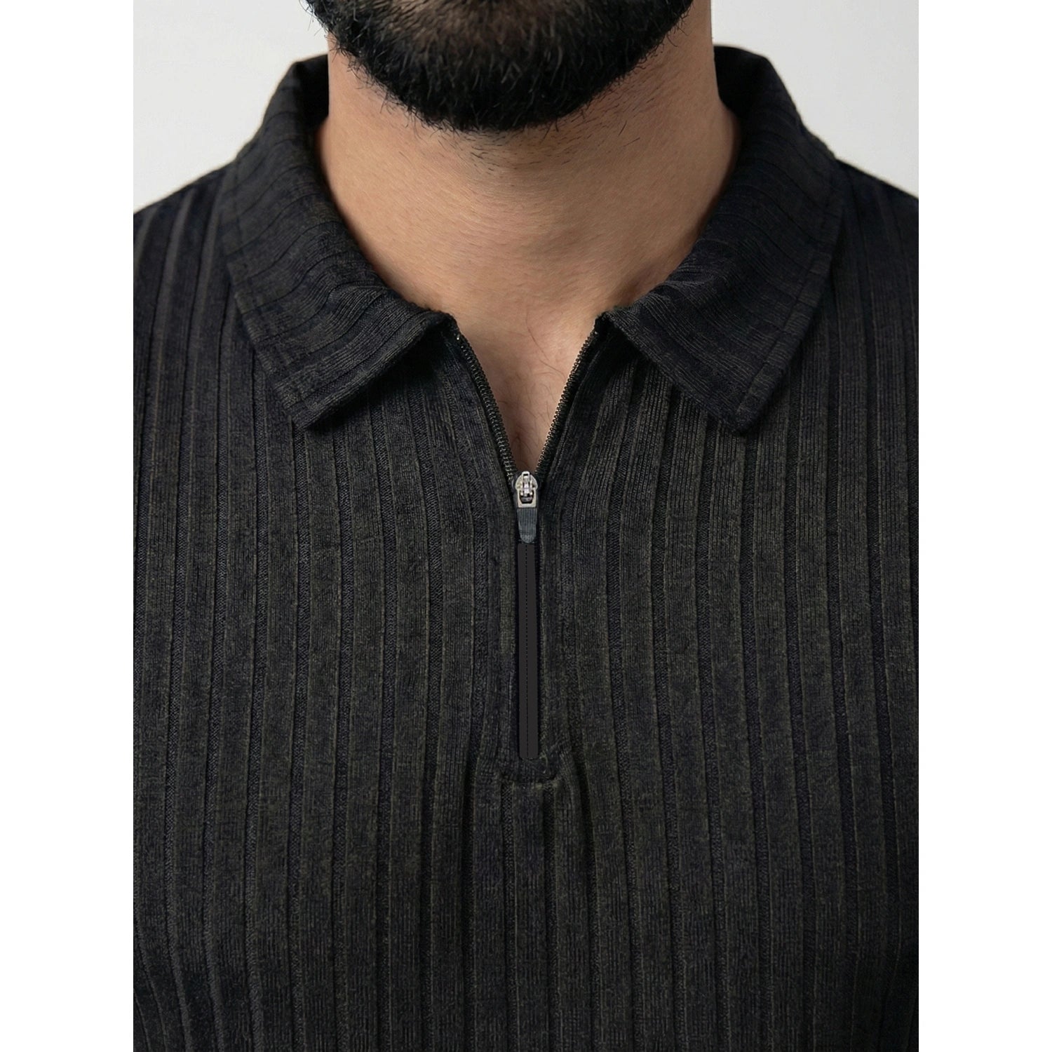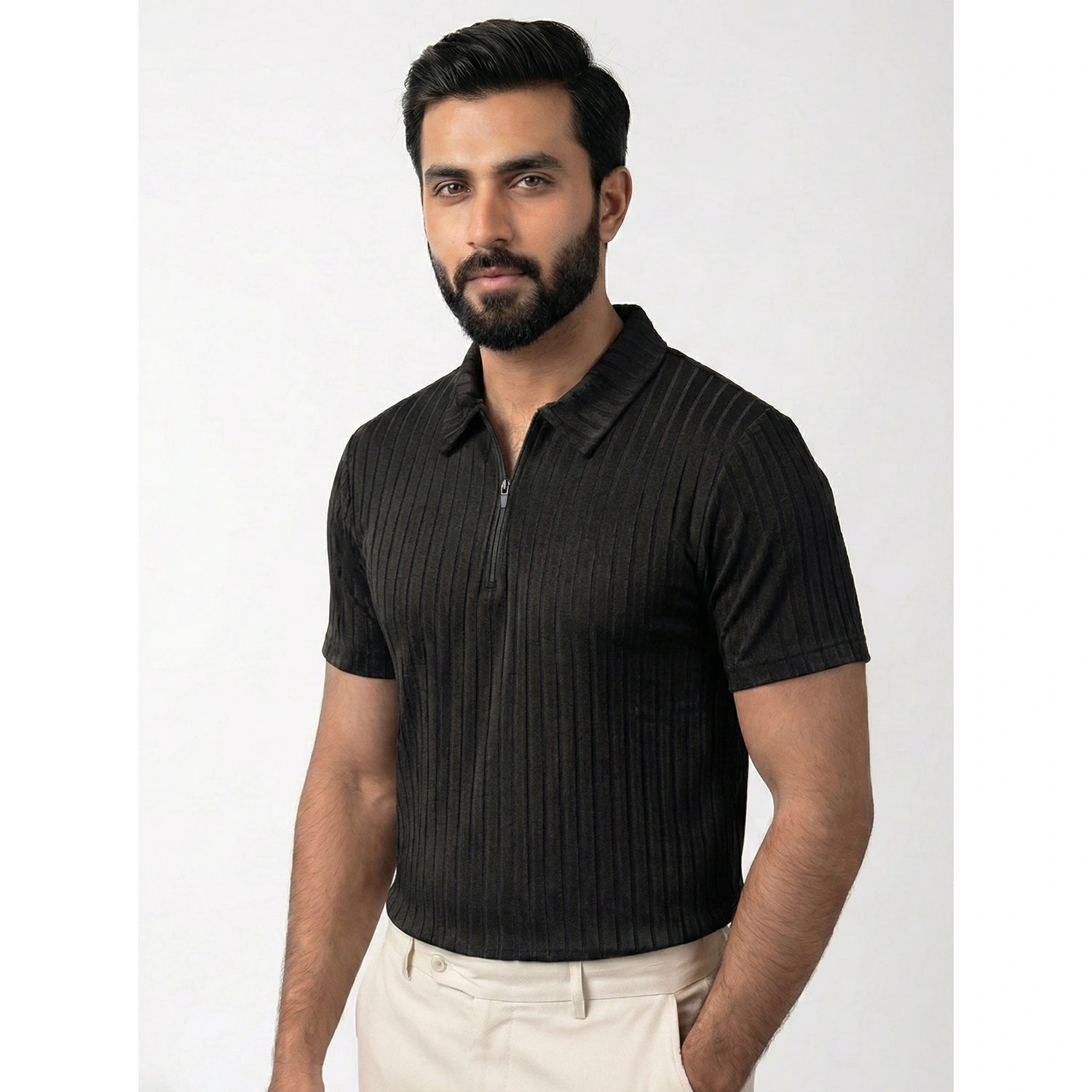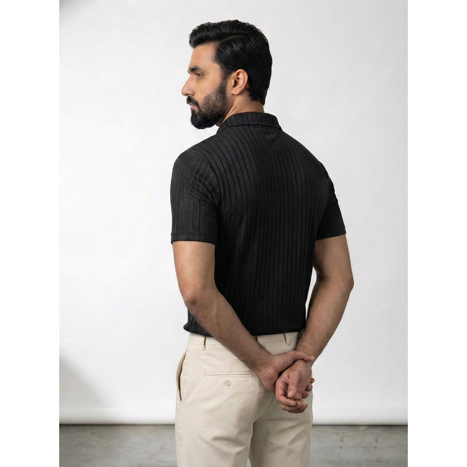 xElevate your casual wardrobe with this Black Drop Needle Zipper Polo. Crafted from a premium polyester viscose blend, it delivers exceptional comfort with a luxurious feel. The stretchable fabric moves with you, ensuring unrestricted mobility throughout your day. The sleek drop needle detailing and convenient zipper closure add modern sophistication to any outfit. Perfect for layering or wearing solo, this versatile piece transitions seamlessly from office to weekend. Model is wearing L