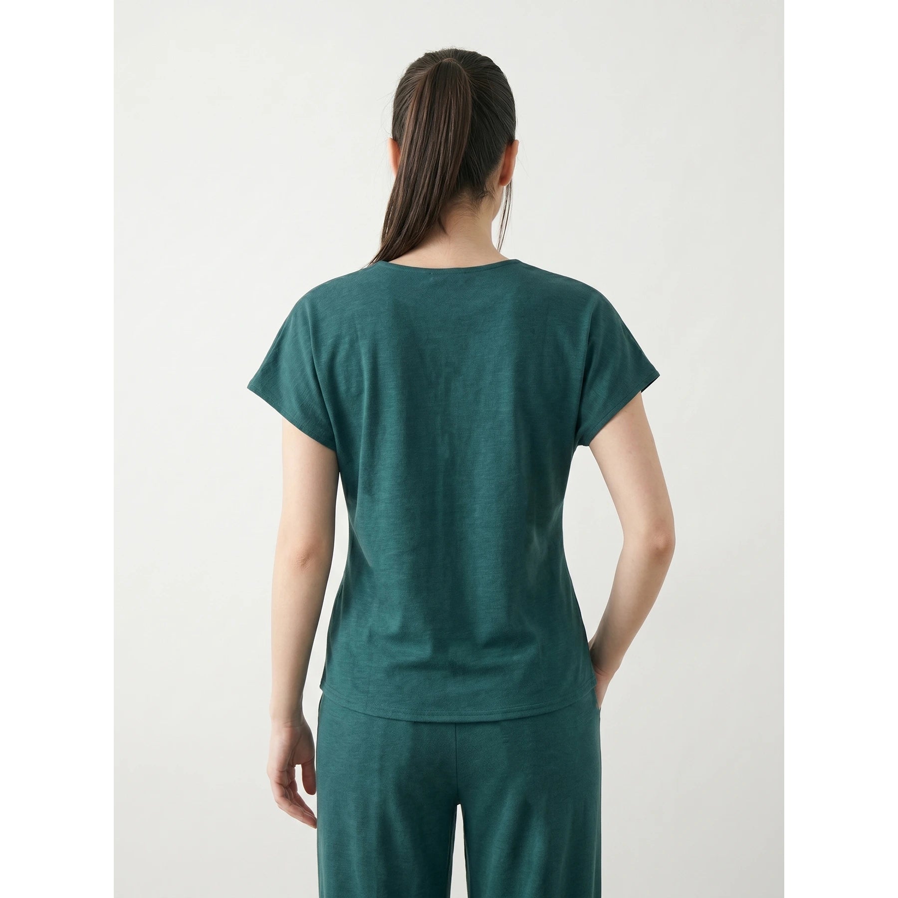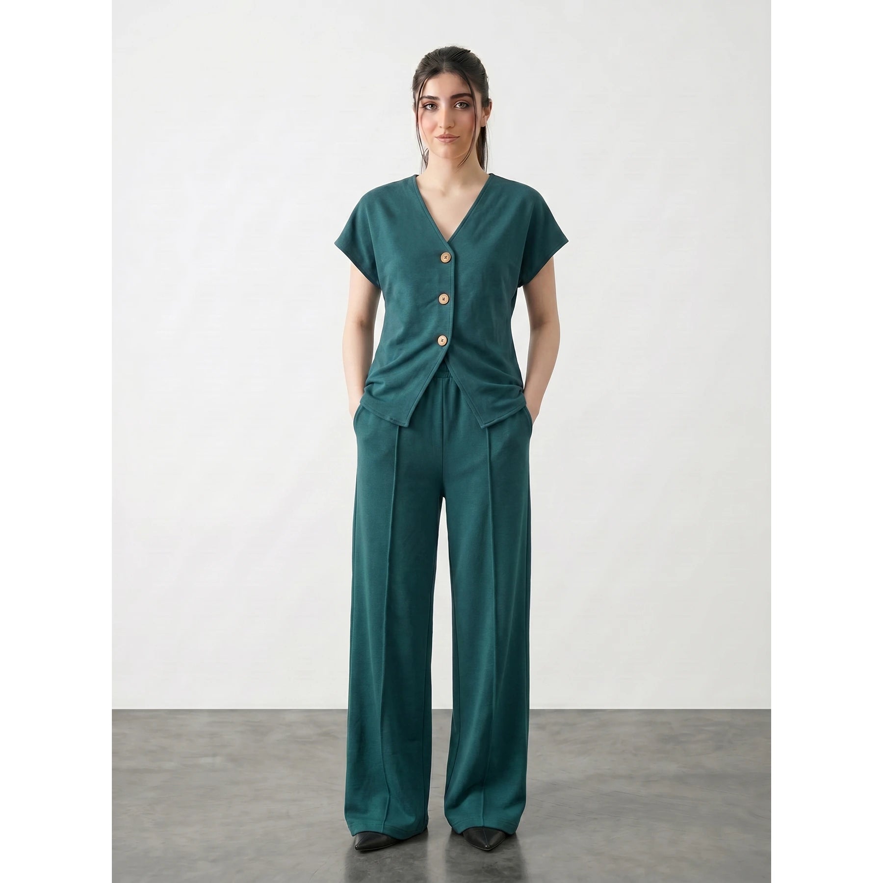 Jewel-toned precision meets sculptural comfort. The Teal Interlock Button Down Top is a masterclass in modern, architectural tailoring designed for the contemporary lifestyle. Rendered in a deep, multi-dimensional teal hue, this top features a clean V-neckline and structured short sleeves that define the frame. The silhouette is elevated by a signature angled front hem and a trio of contrasting natural buttons, providing a curated, high-end aesthetic that transitions effortlessly from a polished home setting to a sophisticated day ensemble.