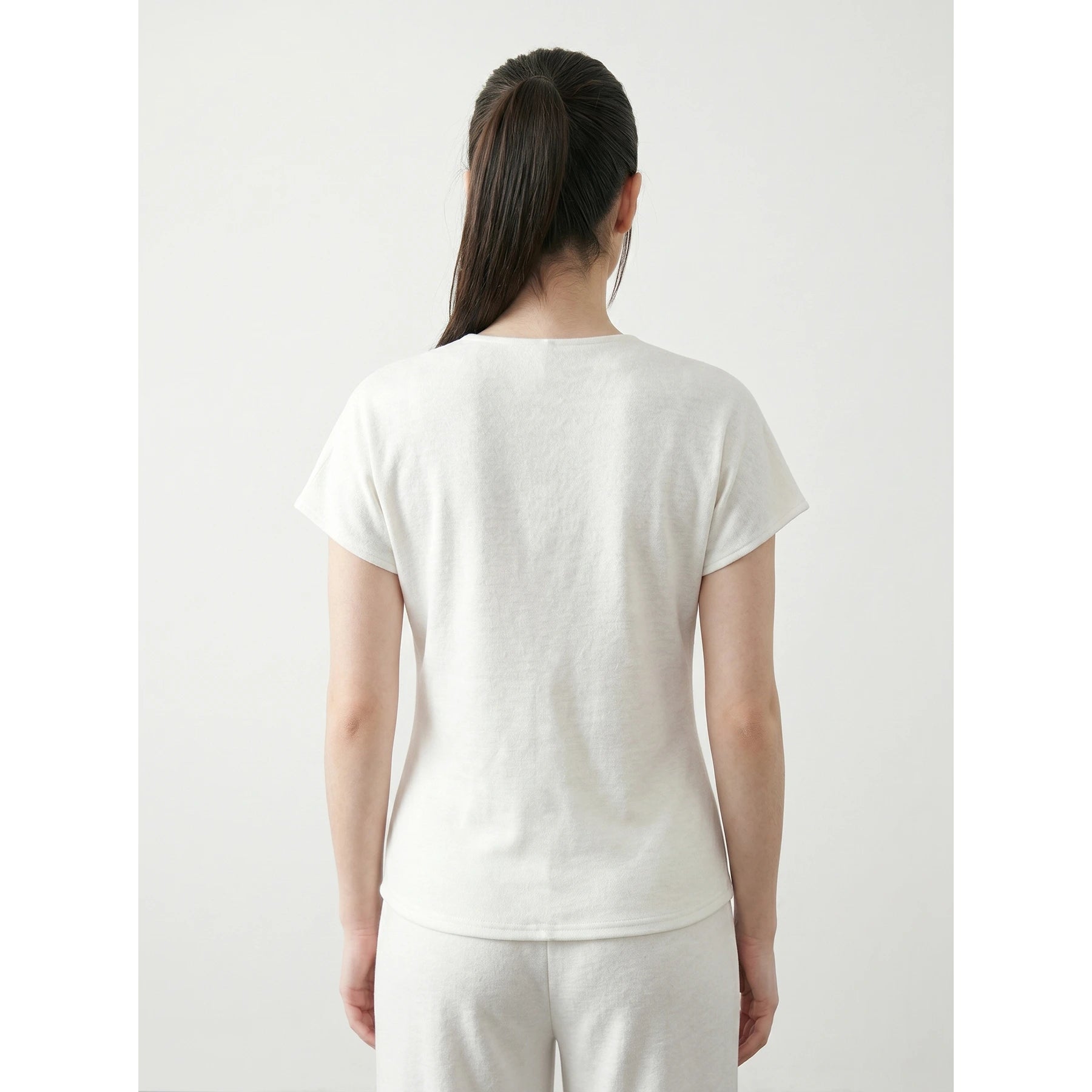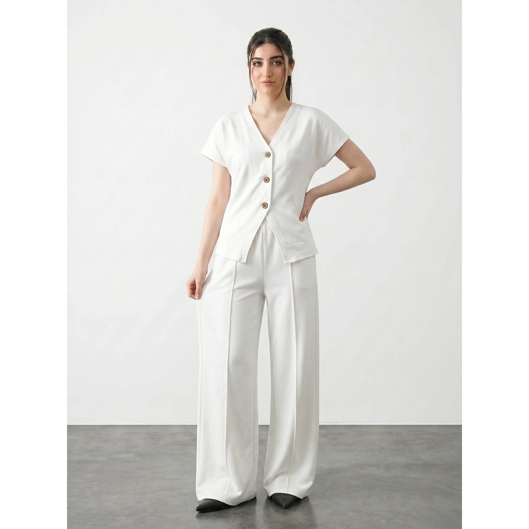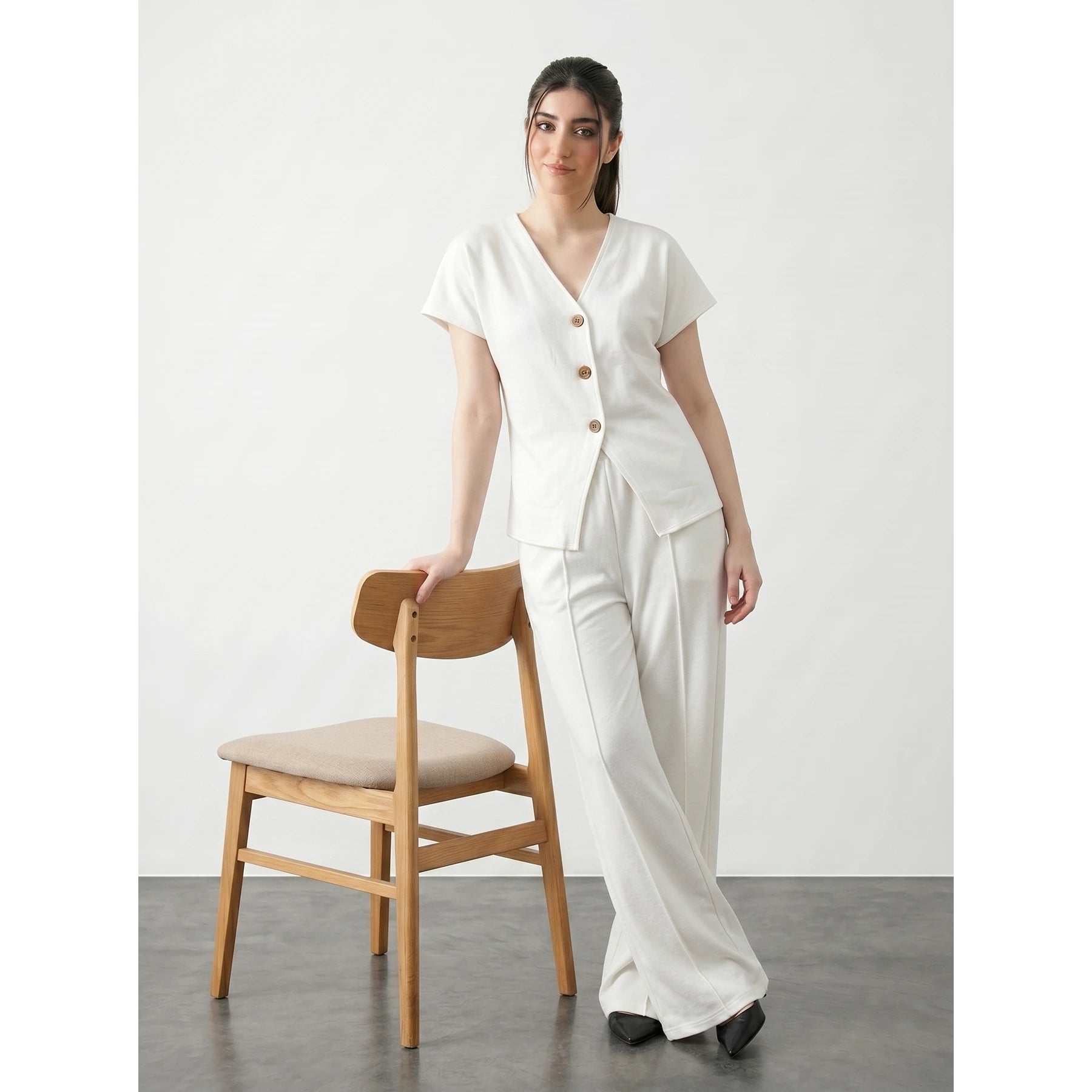 Sculptural minimalism meets breathable comfort. The Off-White Interlock Button Down Top is a masterclass in clean, architectural design. Featuring a luminous ivory hue, this top combines a sharp V-neckline with modern short sleeves for a sophisticated, structured silhouette. The design is elevated by a signature angled front hem and a trio of contrasting natural-toned buttons, providing a curated aesthetic that transitions effortlessly from a polished workspace to refined loungewear.