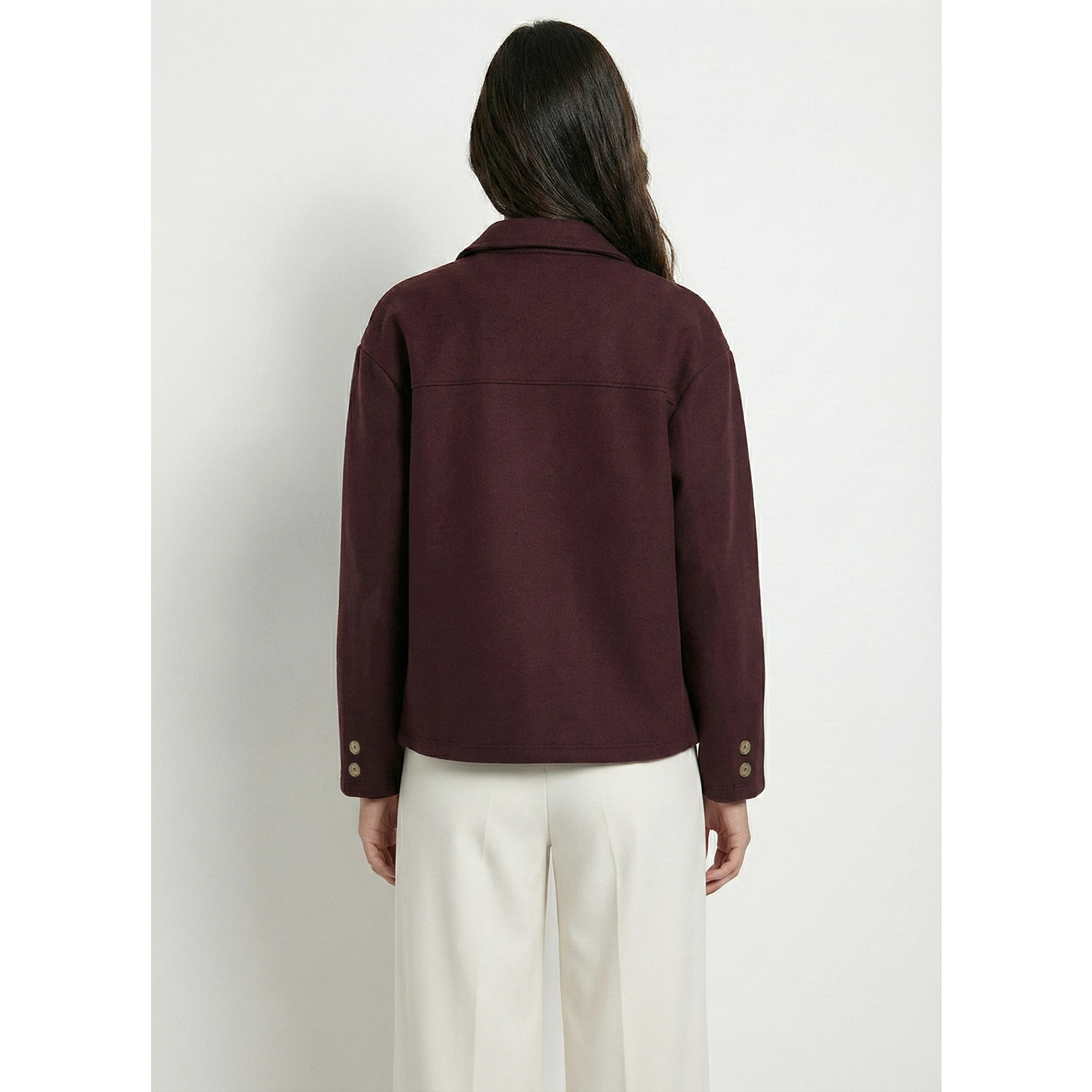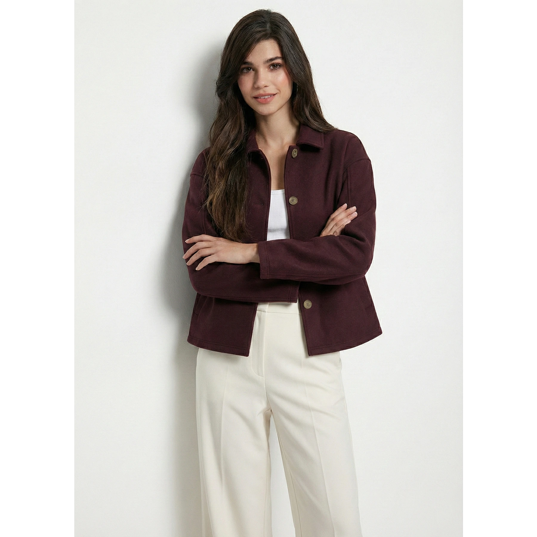 xElevate your everyday style with this sleek burgundy button-down coat. Crafted from soft fleece, it delivers warmth without the bulk, while practical side pockets keep your essentials within reach. Perfect for layering or wearing solo, this versatile piece transitions seamlessly from casual outings to polished occasions.