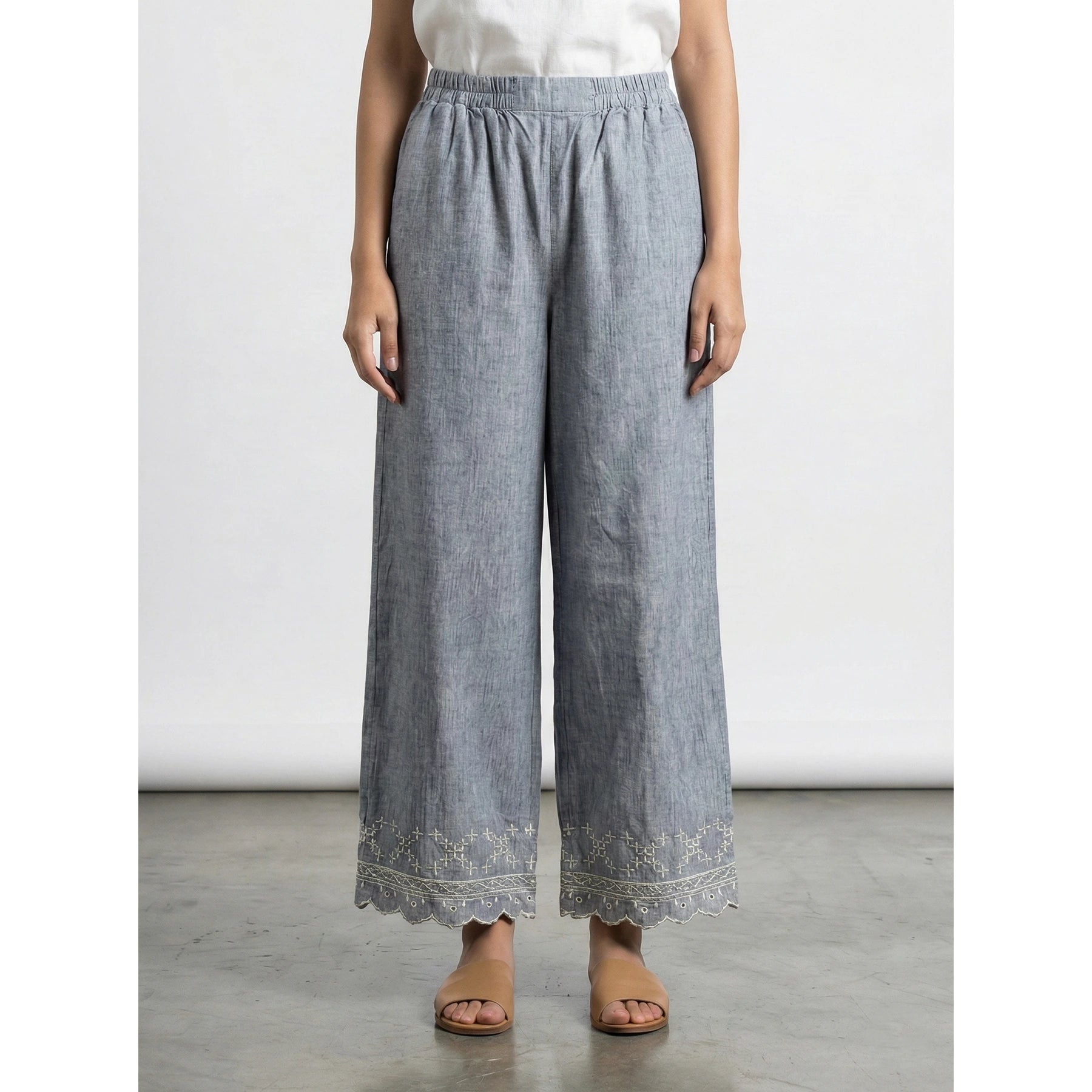 Lightweight, breezy, and effortlessly feminine. These chambray culottes feature a wide-leg silhouette and intricate hem detailing, making them the perfect choice for elevated warm-weather styling.