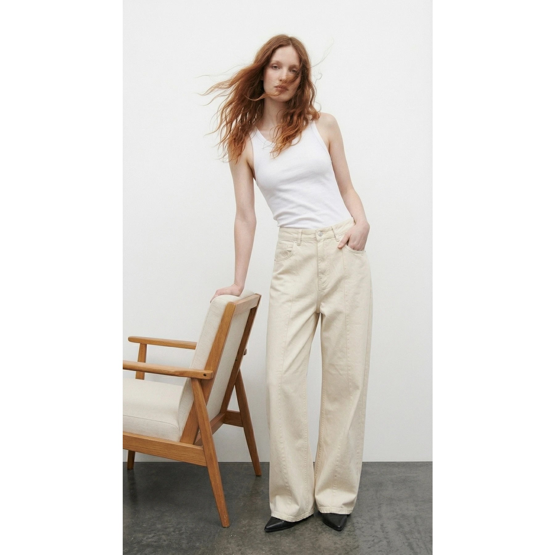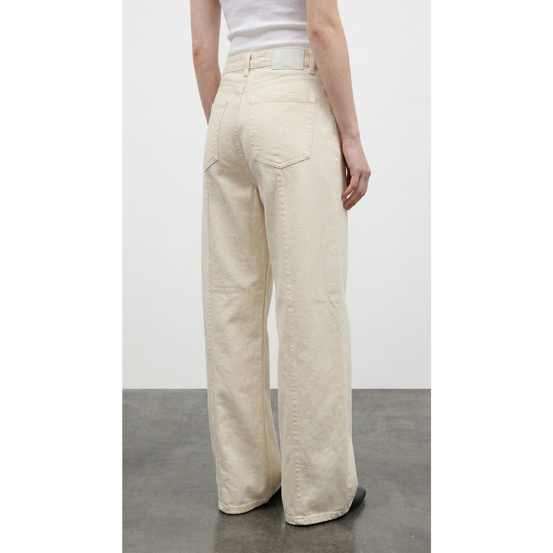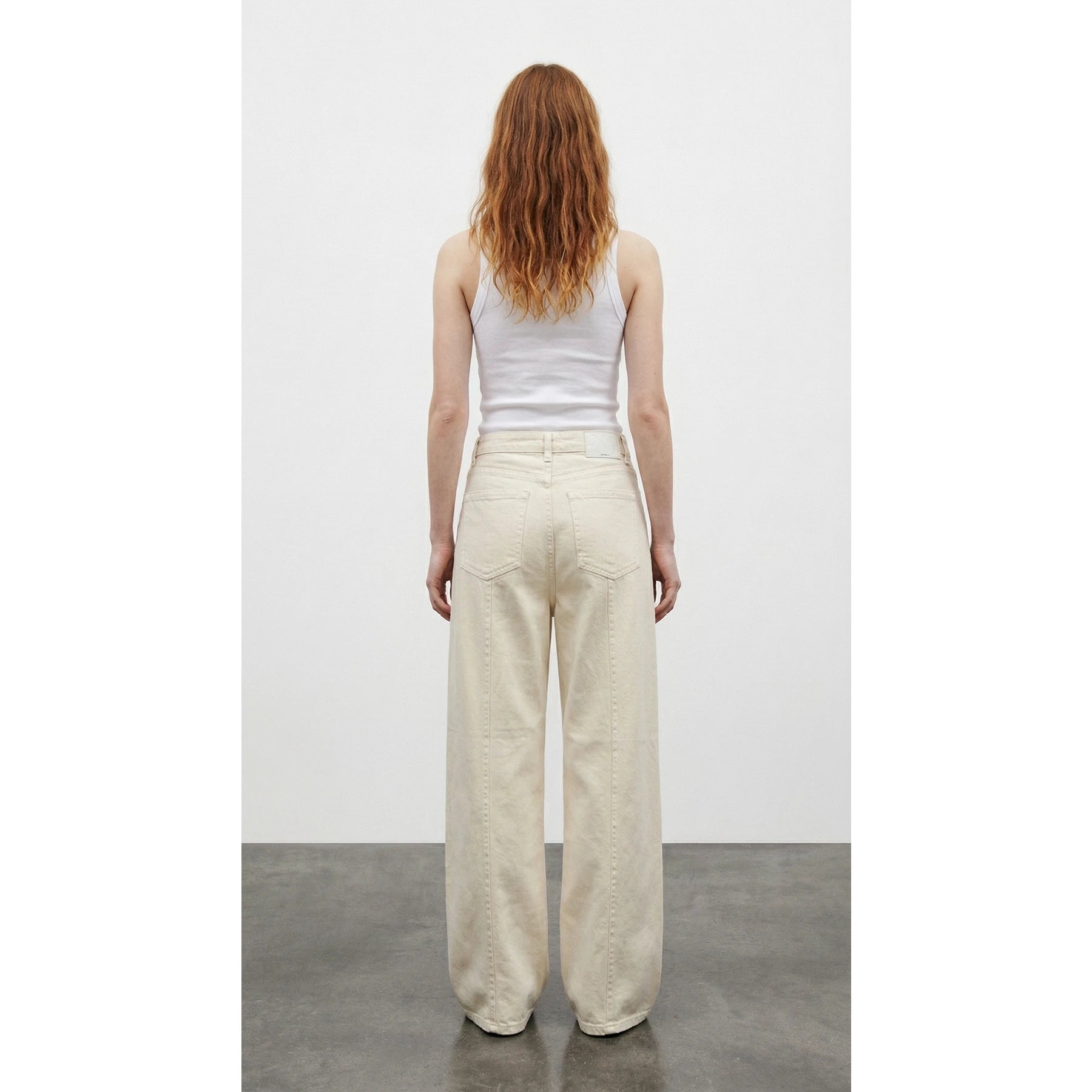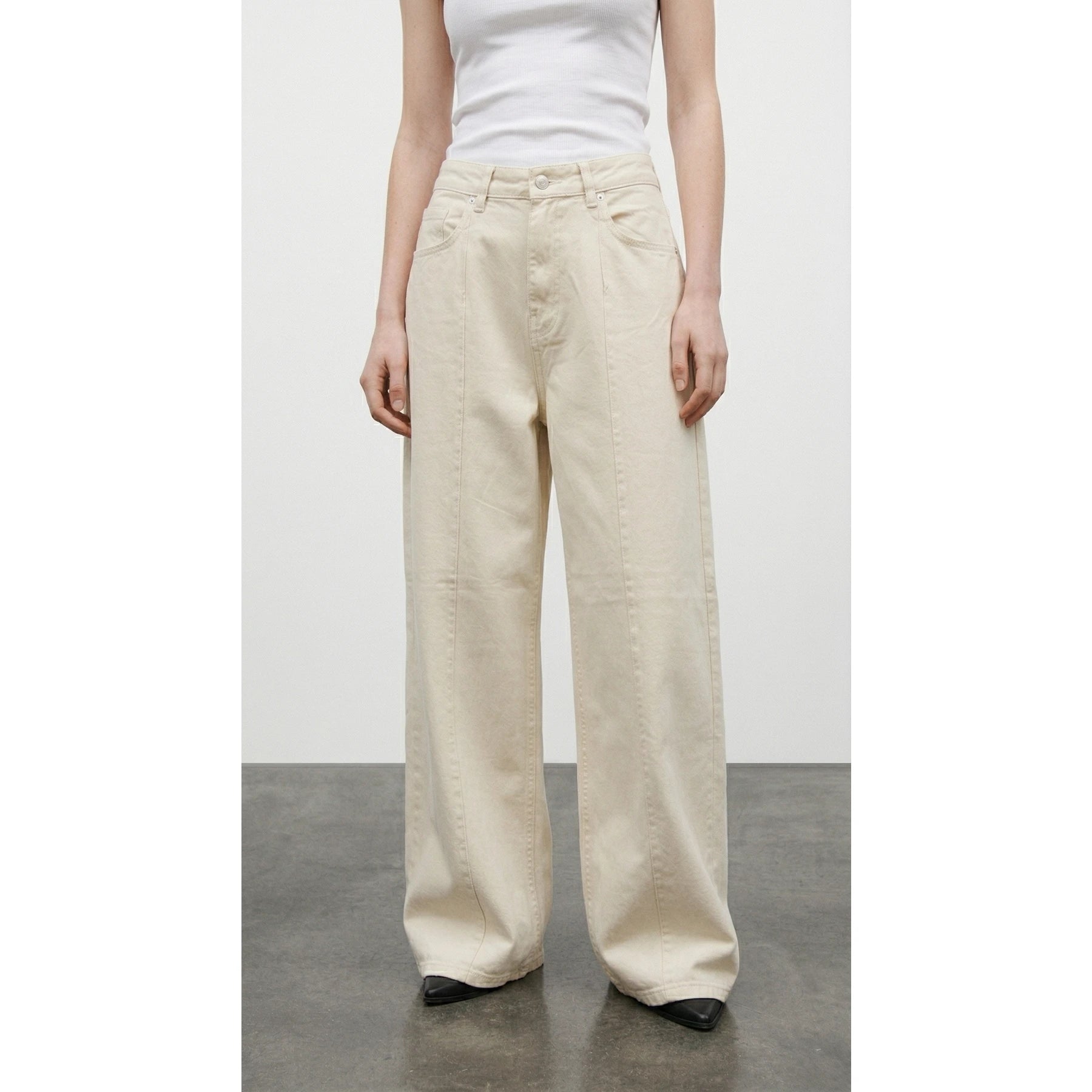 A refined, architectural take on the relaxed silhouette, these cream-colored jeans blend a modern baggy fit with sharp, elongating design details.